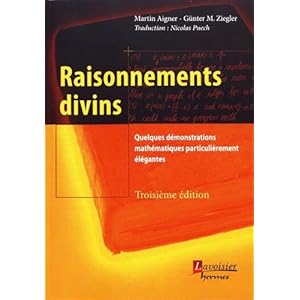 -Raisonnements divins : quelques démonstrations ....La 4e de couv. indique : "Cet ouvrage regroupe quelques démonstrations mathématiques choisies pour leur élégance. Il expose des idées brillantes, des rapprochements inattendus et des observations remarquables qui apportent un éclairage nouveau sur des problèmes fondamentaux.